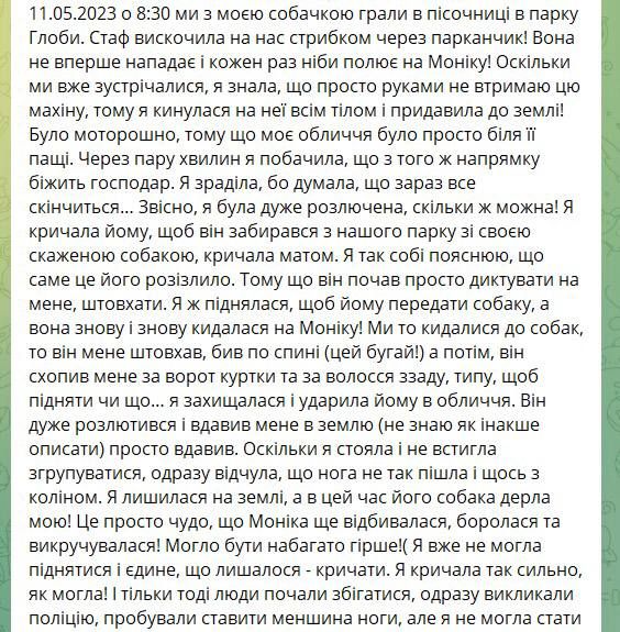 Через несколько минут подбежал владелец агрессивного пса, и женщина высказала ему свои претензии и сказала, чтобы он убирался из парка со "своей бешеной собакой". Вместо того чтобы успокоить свое животное, он стал ругаться на женщину и толкать ее на землю. Днепрянка ударила мужчину в ответ.