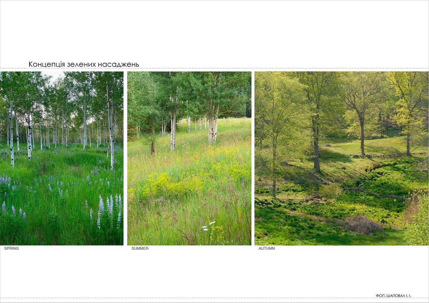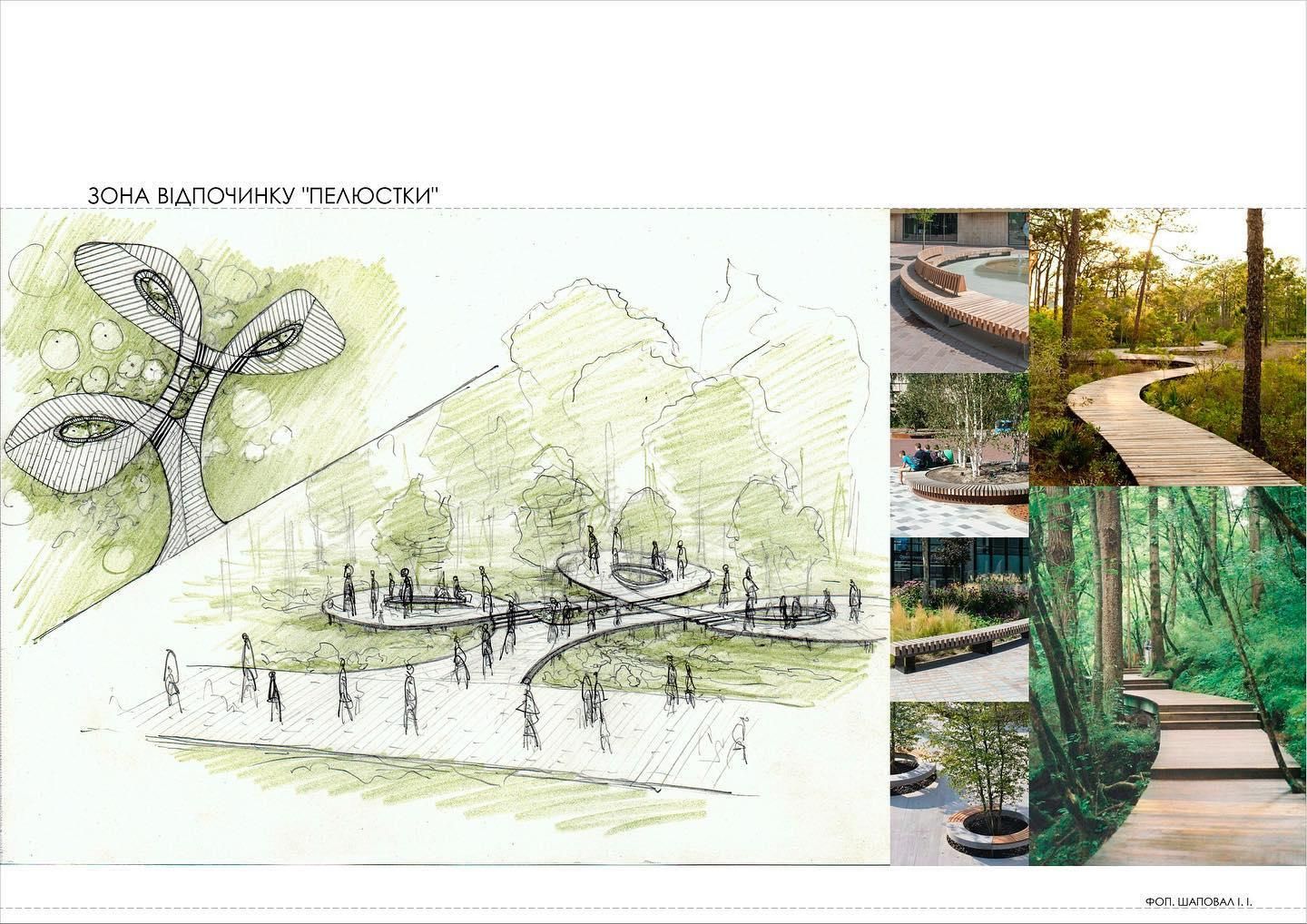 Подготовило ее архитектурное бюро Shapoval & Partners. На генеральном плане прописали расположение разных локаций для отдыха. Детских площадок, зоны отдыха с барбекю, зоны отдыха "лепестки". Согласно этой концепции в парке также могут появится ручьи и озеро.