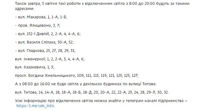 Обновлено 2х: в 18:38 в ТГ-канале "ЦЭКа" сообщили, что все работы будут продолжаться с 08:00 до 17:00, на улице Титова свет завтра не планируют выключать.