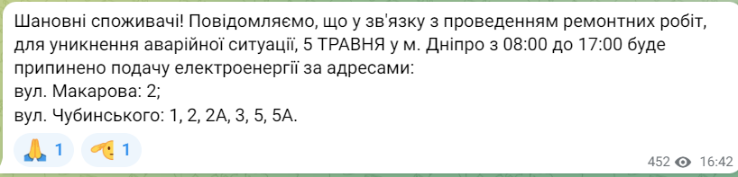 В Днепре в пятницу снова некоторым жителям выключат свет на 12 часов: адреса