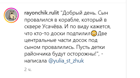 Добрий день. Сын провалился в корабле, который находится в сквере Усачева. Кажется, что кто-то доски подпилил. Две центральные части досок под сыном провалились. Пусть дети будут осторожны! – написала она.