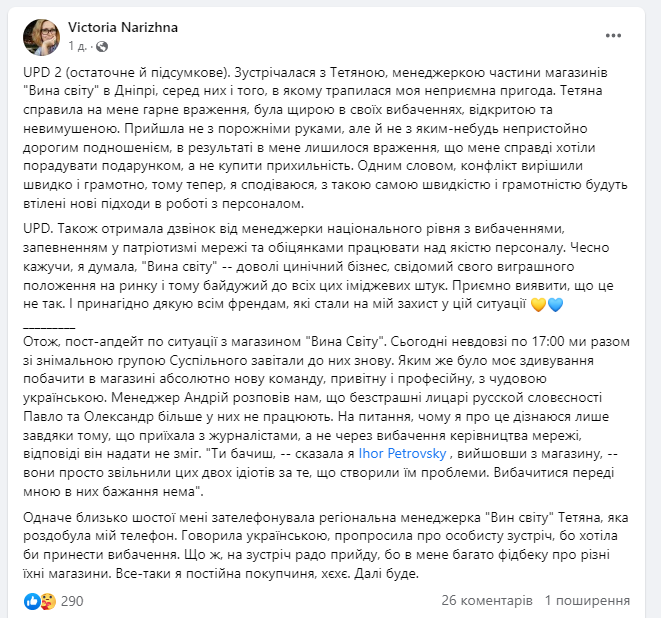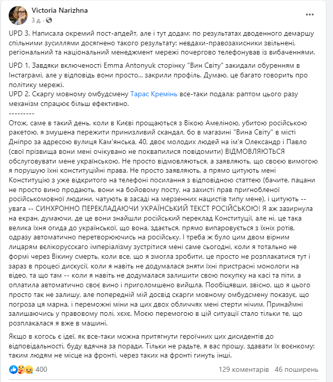 В магазине "Вина Мира" в городе Днепр по адресу улица Каменская, 40, двое молодых людей по имени Александр и Павел (свои фамилии они мне ожидаемо не поспешили сообщить) ОТКАЗАЛИСЬ обслуживать меня на украинском. Не просто отказались, а заявили, что своим требованием я нарушаю их конституционные права. Не просто заявили, а прямо цитировали мне Конституцию по уже открытой на телефоне ссылке с соответствующей статьей (видите, пацаны не просто вино продают, они на боевом посту, на защите прав угнетенного русскоязычного человека, подстерегают в засаде мерзких нацистов типа меня), и цитируют — внимание — СИНХРОННО ПЕРЕВОДЯ УКРАИНСКИЙ ТЕКСТ НА РУССКИЙ! – написала Виктория Нарижная.