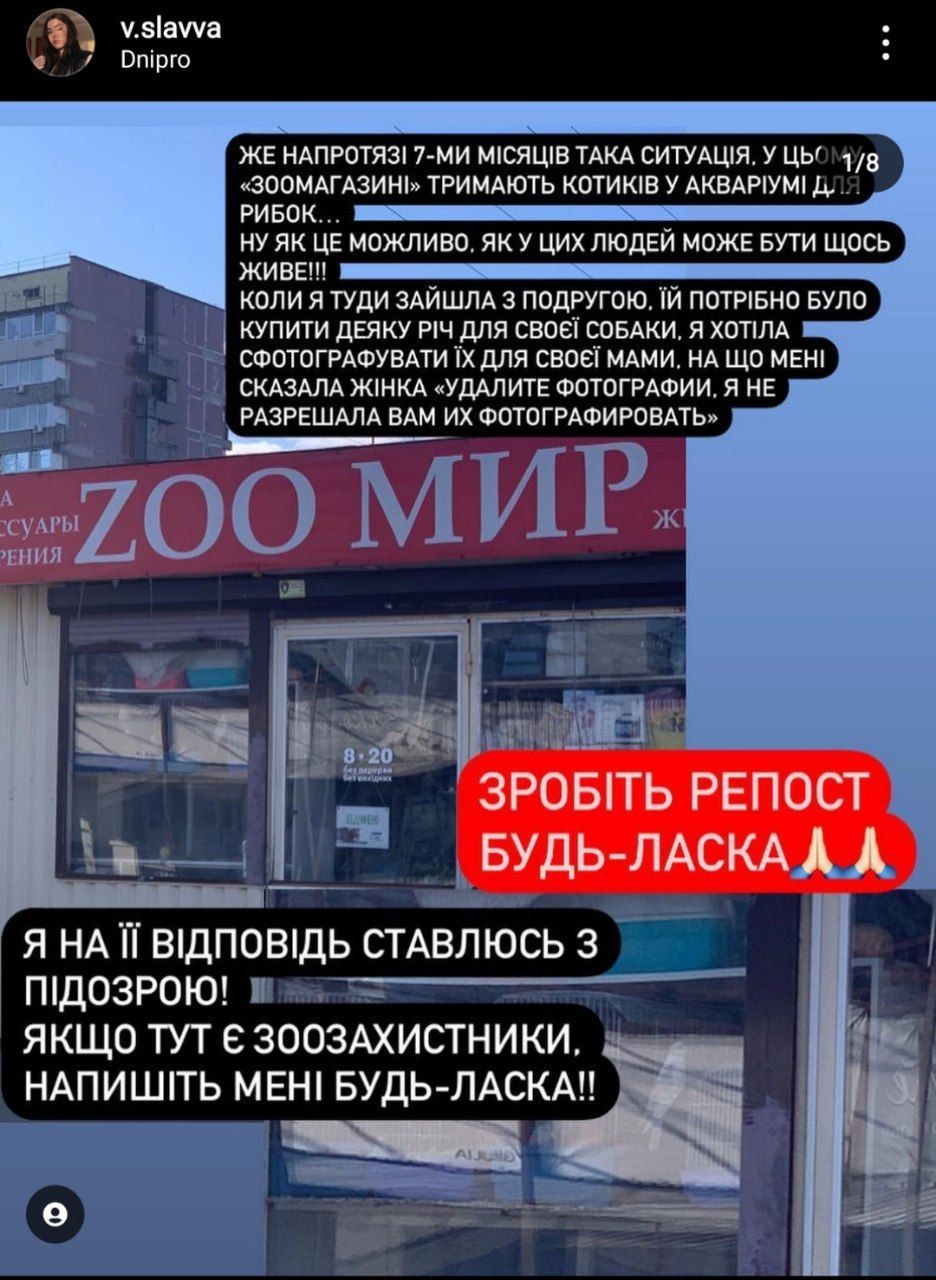 По словам девушки, в одном из зоомагазинов содержат кошек в тесном аквариуме для рыбок, а кормят испорченной пищей. Поэтому котики, которым все же удается сбежать из магазина к новым хозяевам, часто нуждаются в помощи ветеринаров, а некоторые умирают от тяжелых болезней. В таких "спартанских" условиях живут не только кошки. Днепряне утверждают, что владелица магазина мучает и других животных.