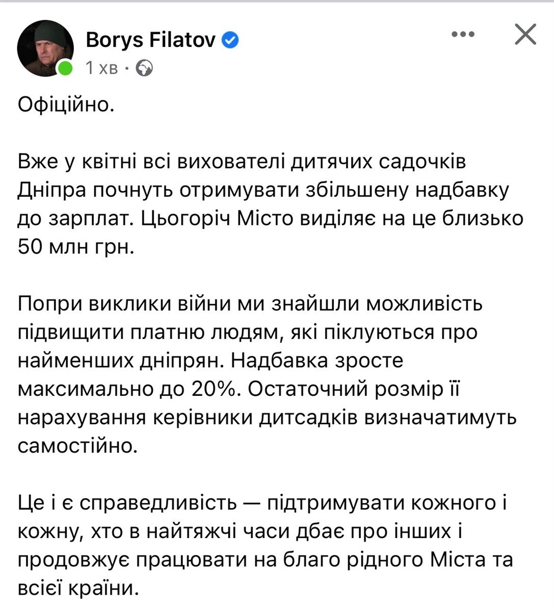 Несмотря на вызовы войны, мы нашли возможность повысить зарплату людям, которые заботятся о самых маленьких днепрянах. Это и есть справедливость — поддерживать каждого и каждую, кто в трудные времена заботится о других и продолжает работать на благо родного города и всей страны, — отметил Филатов.