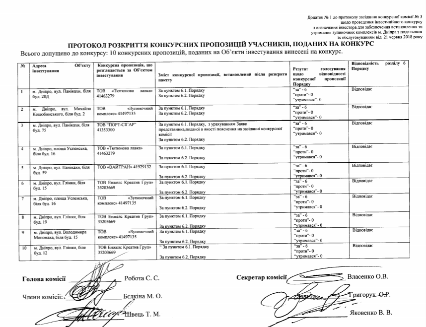 Согласно протоколу, по каждому объекту были назначены конкретные инвесторы, которые будут отвечать за данные объекты.