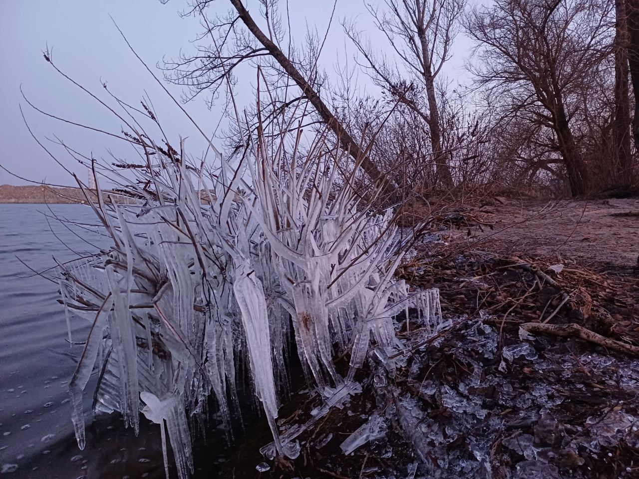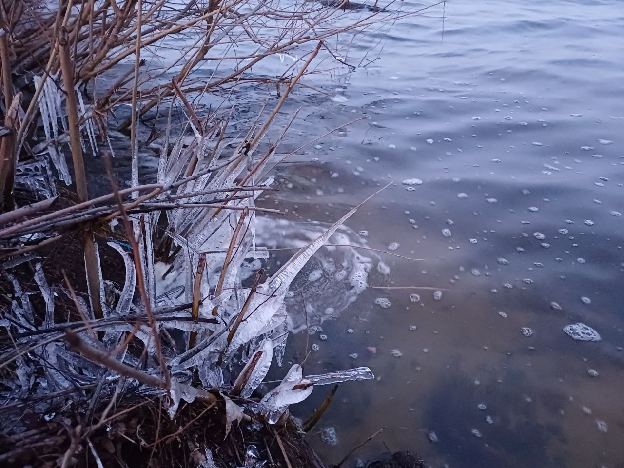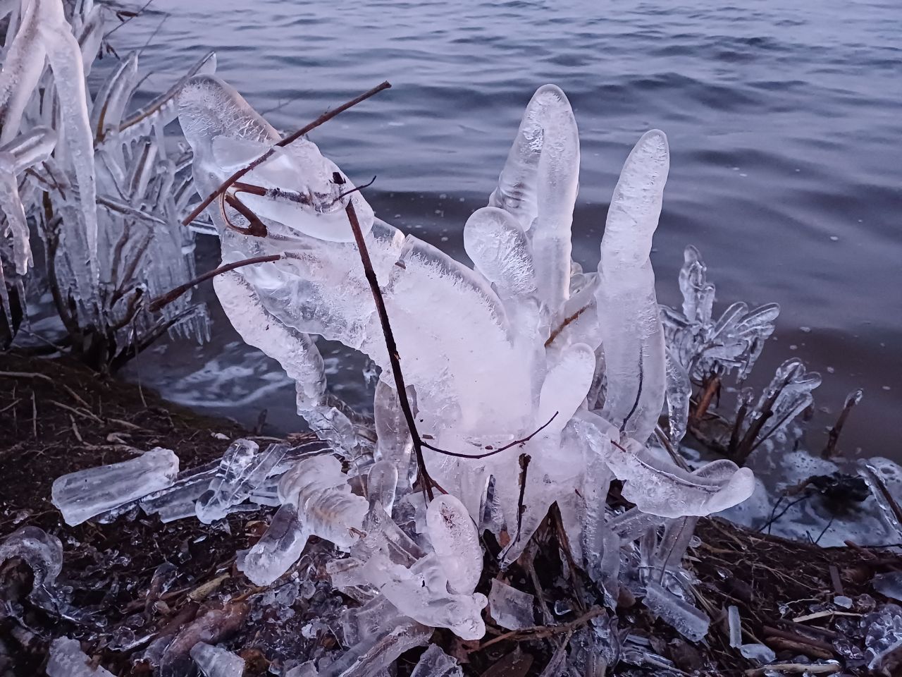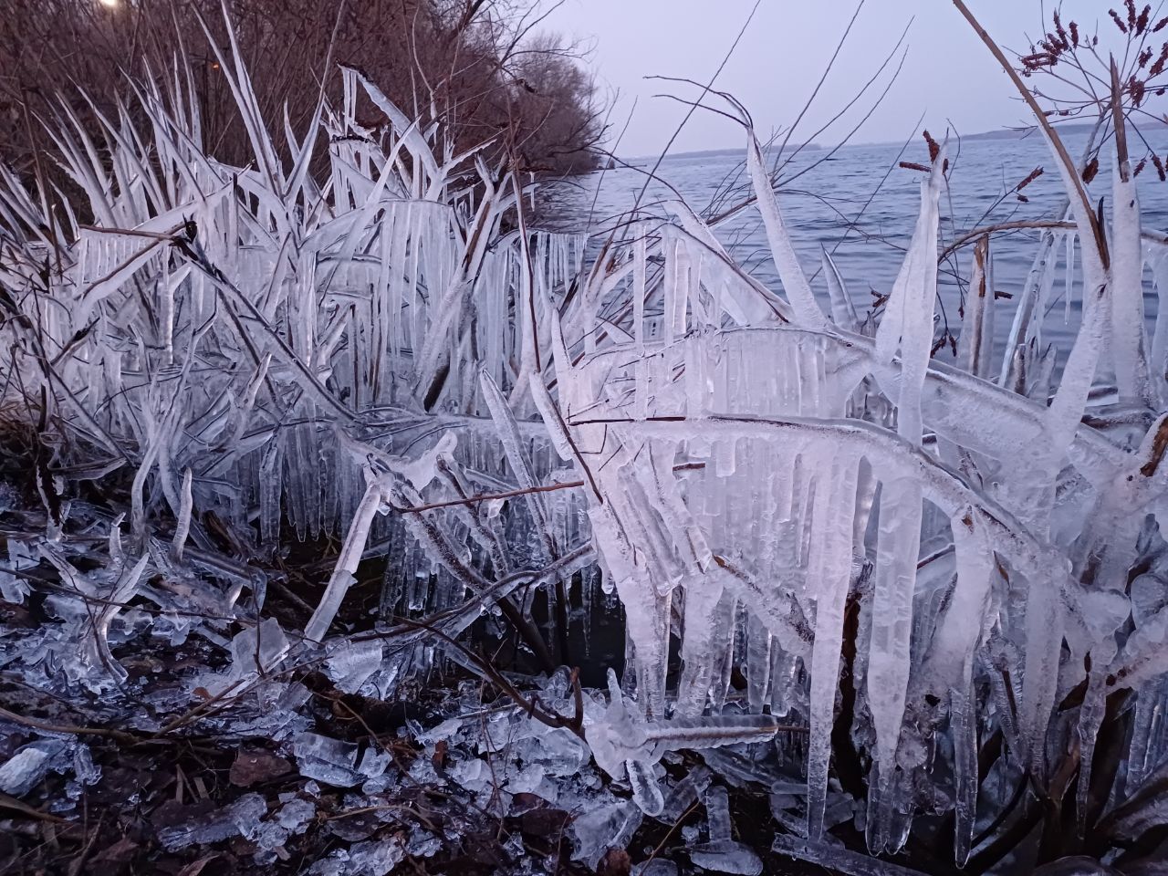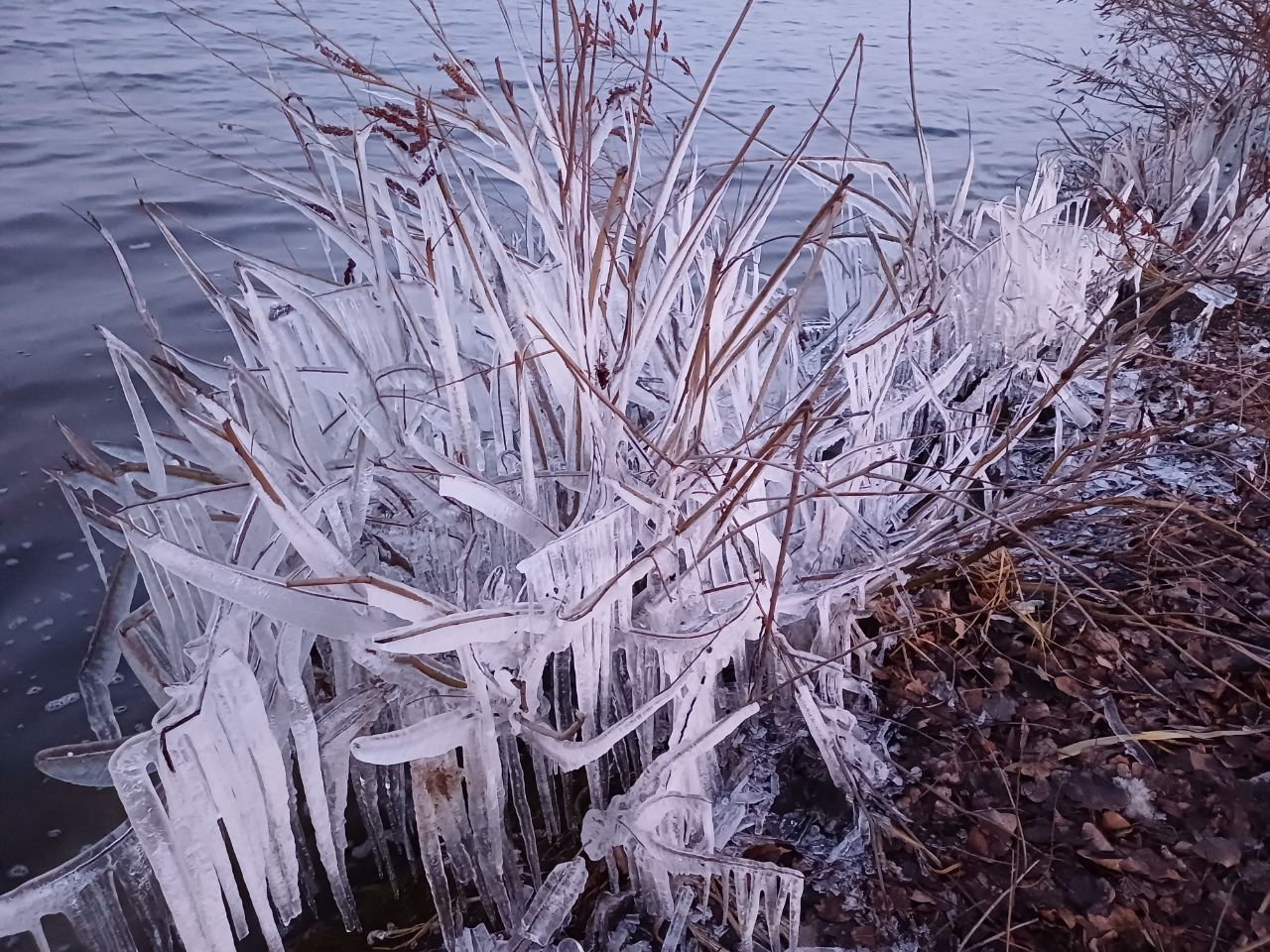 Кустарники у воды омыло волнами, а потом сковало морозом. Поэтому веточки обледенели и растения превратились в ледяные кусты. Понемногу подмерзает и вода у берега.