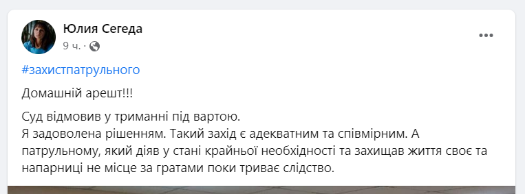 Это решение прокомментировала адвокат задержанного патрульного Юлия Сегеда. Она отметила, что “такая мера является адекватной и соразмерной”.