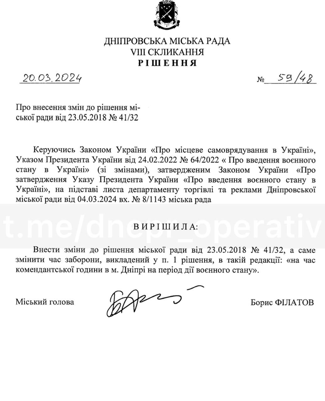 Внести изменения в решение городского совета от 23.05.2018 № 41/32, а именно изменить время запрета, изложенный в п. 1 решения, в следующей редакции: "на время комендантского часа в г. Днепр на период действия военного положения".