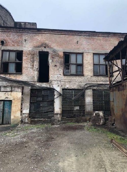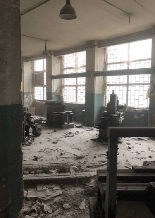 Завод, а это 11506 м.кв площади продается со всеми постройками и оборудованием. На территории есть здание заводоуправления, гараж, мастерские, склад. В здание завода есть несколько прессов, пилы, станки, но оборудование не работающее. В помещении гаража стоят старые грузовые машины, автобус и «жигули», выпущенные более 30 лет назад.