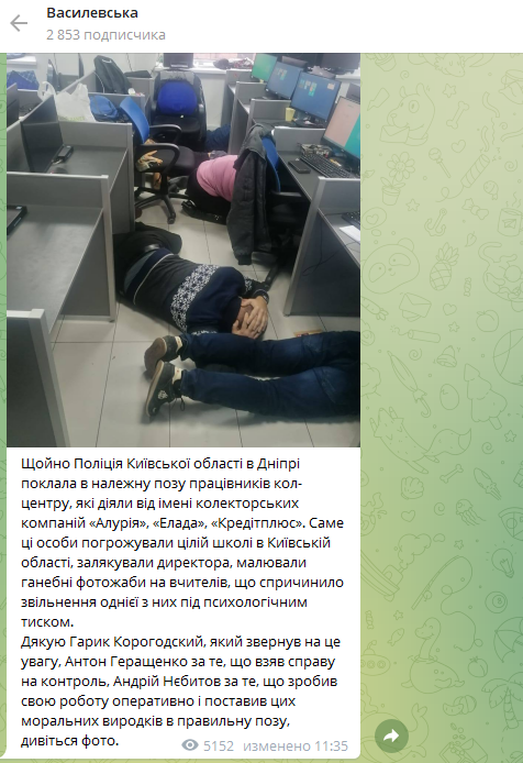 Известно, что работники колл-центра работали от имени таких предприятий как "Алурия", "Эллада", "Кредитплюс". Именно сотрудники этого колл-центра угрожали школе в Киевской области. Запугивали директора, а на одну учительницу так морально давили, что она уволилась с работы.