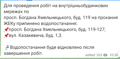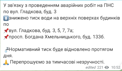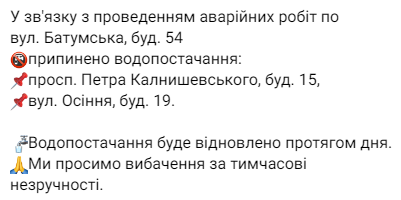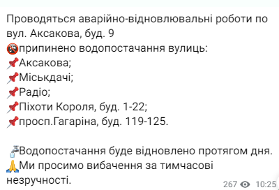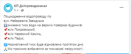 Как сообщили в КП "Днепрводоканал", это связано с повреждением водопровода на ул. Набережная Заводская.