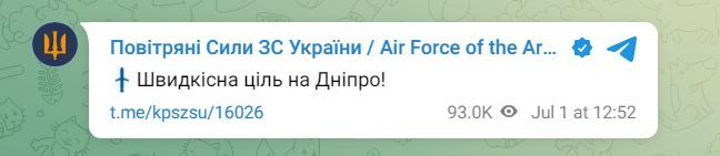 Во время последней тревоги Воздушные силы ВСУ сообщали о скоростной цели в направлении Днепра.