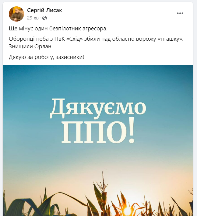 Еще минус один беспилотник агрессора. Защитники неба с ПвК «Схід» сбили над областью вражескую «птичку». Уничтожили Орлана. Спасибо за работу, защитники! – отметил он.