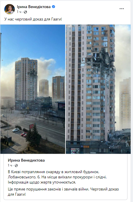 "26 февраля в ГСЧС поступила информация, что по проспекту Лобановского, 6а произошло попадание ракеты в многоэтажный жилой дом (17-18 этаж). Количество пострадавших уточняется. Проводится эвакуация".