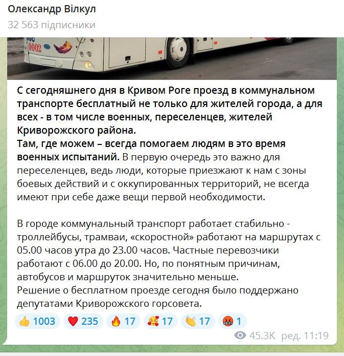 По его словам, с 27 апреля проезд в коммунальном транспорте будет бесплатным не только для жителей города, а и для всех - военных, переселенцев и жителей района. Он отметил, что такое нововведение важно прежде всего для переселенцев, потому что они приехав в Кривой Рог не имеют при себе необходимых вещей.