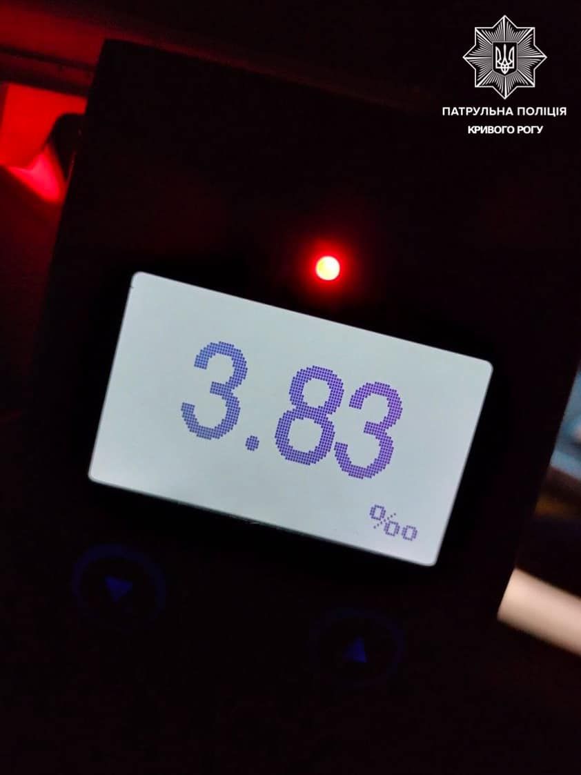 Во время беседы с мужчиной инспекторы заметили у него явные признаки опьянения и предложили пройти осмотр с помощью Драгера. Водитель согласился. Прибор показал 3,83 промилле алкоголя в крови (при норме 0,2 промилле).