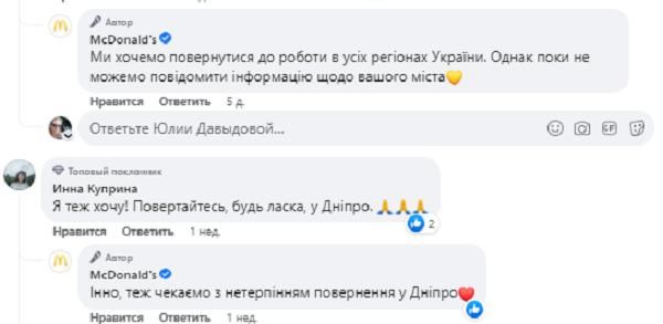 В ответ на комментарии жителей Днепра, представители компании McDonald’s отвечают, что сеть также «скучает» по своим клиентам.