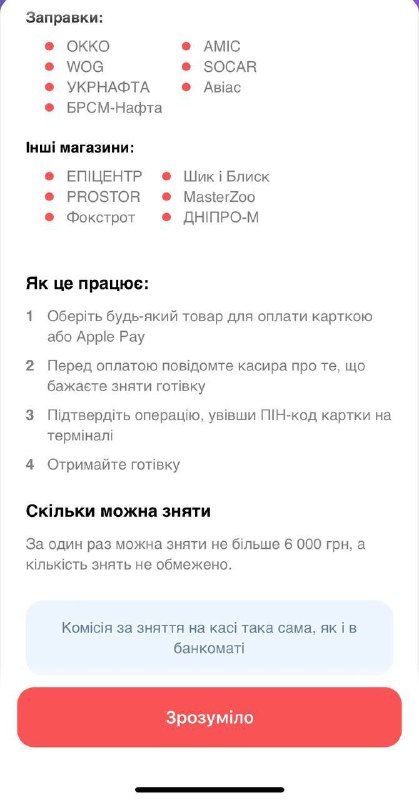 Так, в супермаркетах, аптеках, на заправках и в магазинах, например, "Днепр М", "Эпицентр", "Простор" и т.д., можно на кассе получить наличные.
