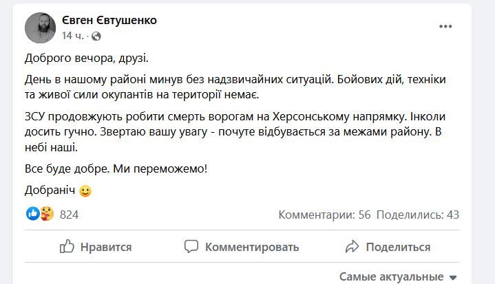 Евгений Евтушенко заверил, что все происходит за пределами района, а в небе наши защитники. Также прошлый день прошел без чрезвычайных ситуаций.