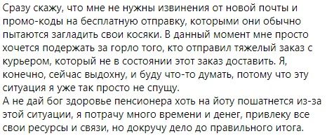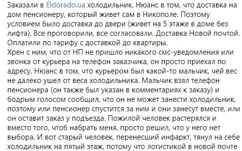 По словам мужчины, курьер службы доставки "Новой почты" приехал без предупреждения и просто позвонил клиенту, чтобы тот помог поднять посылку на этаж. Сотрудник компании сказал по телефону, что не может занести холодильник наверх самостоятельно, поэтому он либо поможет заказчику донести товар до квартиры, либо оставит коробку внизу и уедет. В итоге пожилому мужчине, пережившему инфаркт, пришлось нести холодильник наверх вместе с курьером.