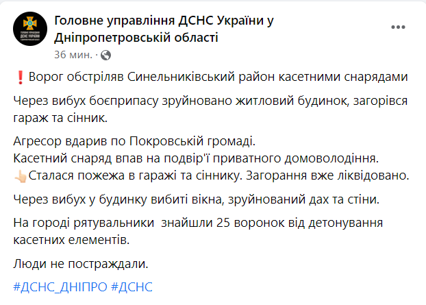 Сегодня, 11 июня, российские оккупанты обстреляли кассетными снарядами Покровскую громаду, что в Синельниковском районе.