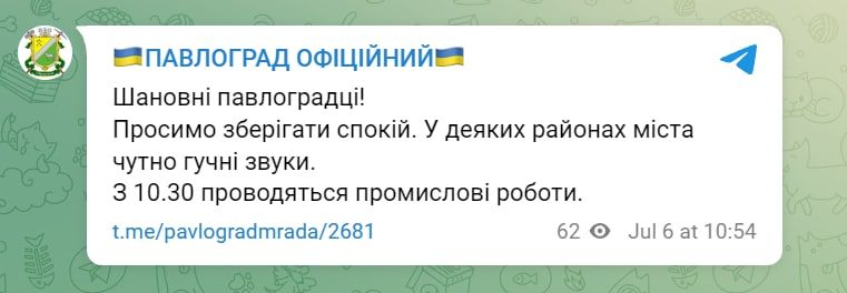 Сегодня 6 июля жители Павлограда могут услышать звуки похожие на взрывы. Об этом сообщили в Павлоградском городском совете. Впрочем, по их словам, переживать не стоит. Это очередные производственные работы на одном из предприятий.
