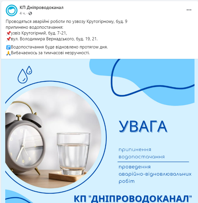 Сегодня, 16 апреля, некоторые жители Днепра остались без водоснабжения.