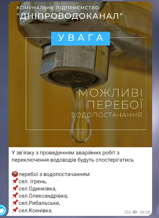 В пригороде Днепра сегодня будут перебои с водоснабжением: кому нужно сделать запасы