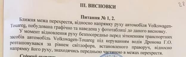 Адвокат Елены Зайцевой Евгений Мельниченко выложил на личной странице в соцсети фото результатов экспертизы. В них речь идет о том, что Дронов находился за стоп-линией у светофора, где должен был остановиться. Кроме того, передней частью авто он был в границах перекрестка на 90 сантиметров.