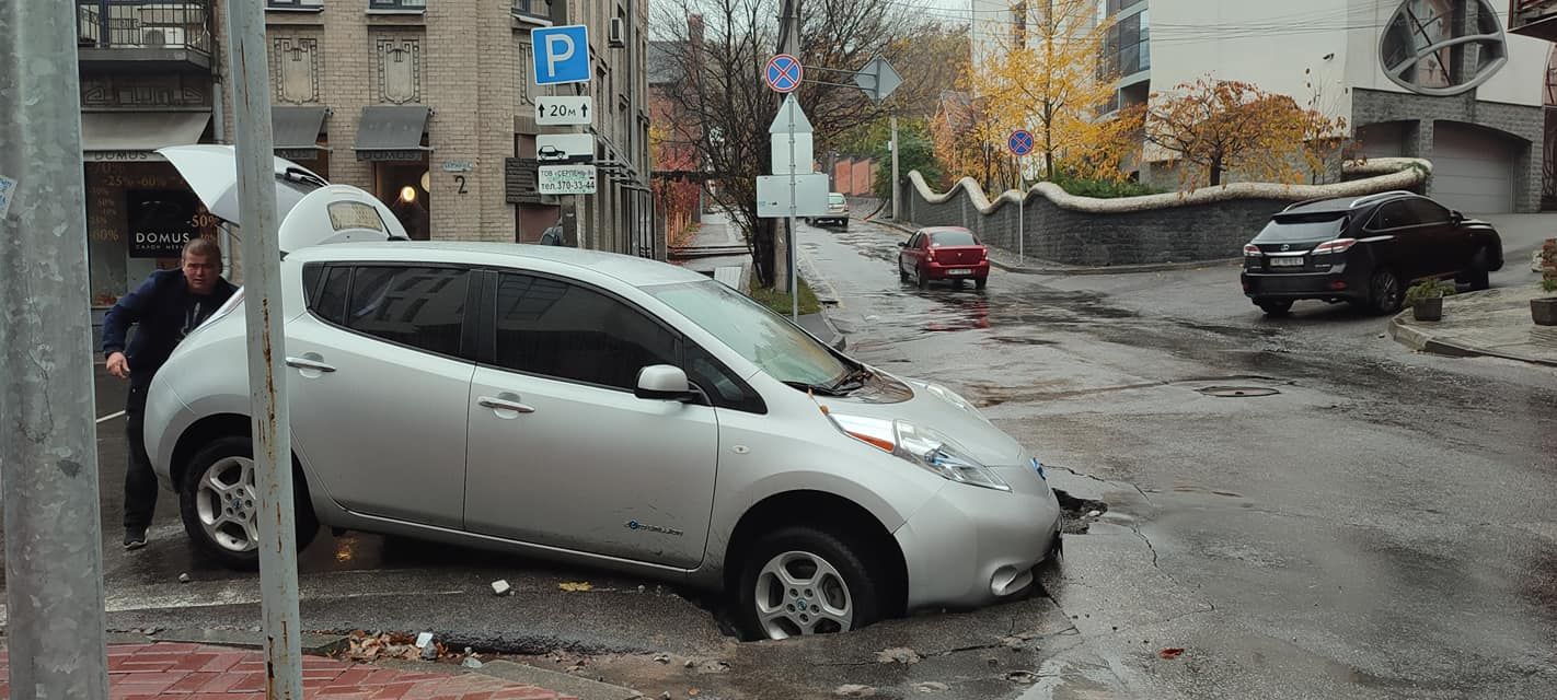 На Баррикадной легковая машина застряла в провалившемся под ней асфальте.