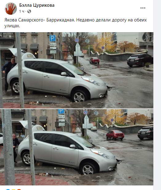 В центре Днепра на пересечении Баррикадной и улицы Якова Самарского провалился асфальт под авто. Об этом сообщает днепрянка Бэлла Цурикова на Facebook, передает dnepr.info. В комментариях свидетели отмечают, что на место инцидента уже приехали работники КП "Днепрводоканал. Также предполагают, что скорей всего провал образовался из-за недавнего прорыва водопровода в этом месте.