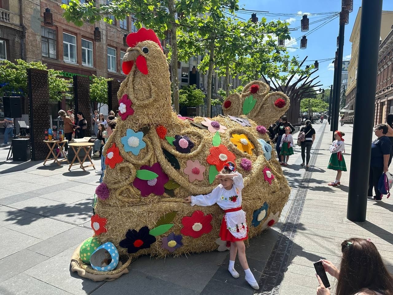 Выступление для горожан подготовили творческие коллективы городского учреждения внешколы "Крылья". Однако внимание днепрян привлекла огромная трехметровая курица, ставшая главным Пасхальным символом на празднике.