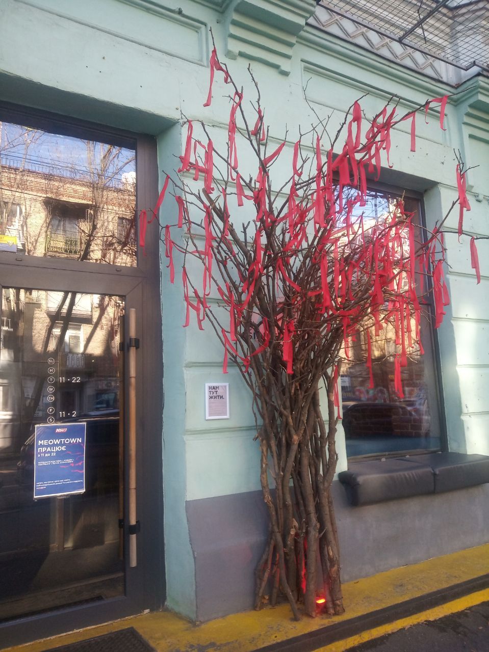 Инсталляция создана в рамках благотворительного проекта «Нам тут жити». Возле ресторана установили азийское дерево, которое является символом стойкости и нерушимости, как и наши военные на фронте, отражающие атаки врага и защищающие нашу территорию. На ветках дерева висят «ленты желаний».