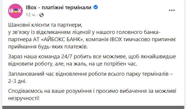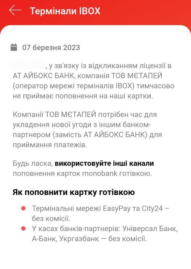 В частности, ликвидацию IBOX Bank, терминалами которого пользовались сотни тысяч украинцев, прокомментировали в Monobank. Там отметили, что точки пополнения IBOX временно не принимают наличные деньги для пополнения карт Mono, поэтому призывают использовать другие способы.