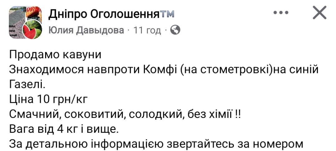 Рекламу по продаже арбузов можно встретить даже в соцсетях. К примеру, фермеры из Желтых Вод предлагают купить бахчевые за 10 грн/кг.