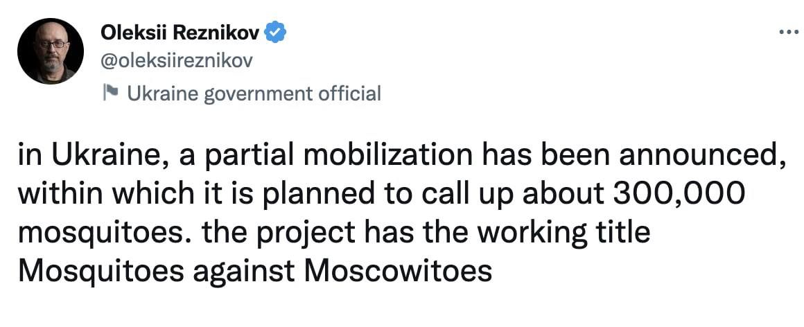 В рамках новой мобилизации Минобороны планирует мобилизовать 300 тысяч боевых комаров. Так потроил россиян министр обороны Украины Алексей Резников.