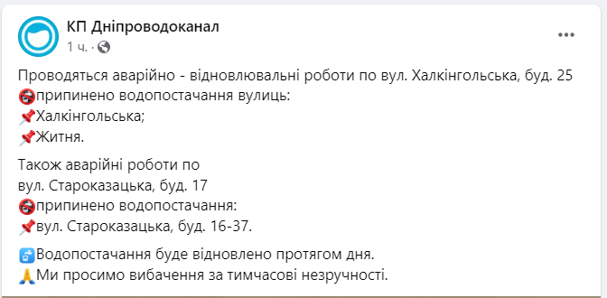 Об этом сообщает КП "Днепрводоканал".