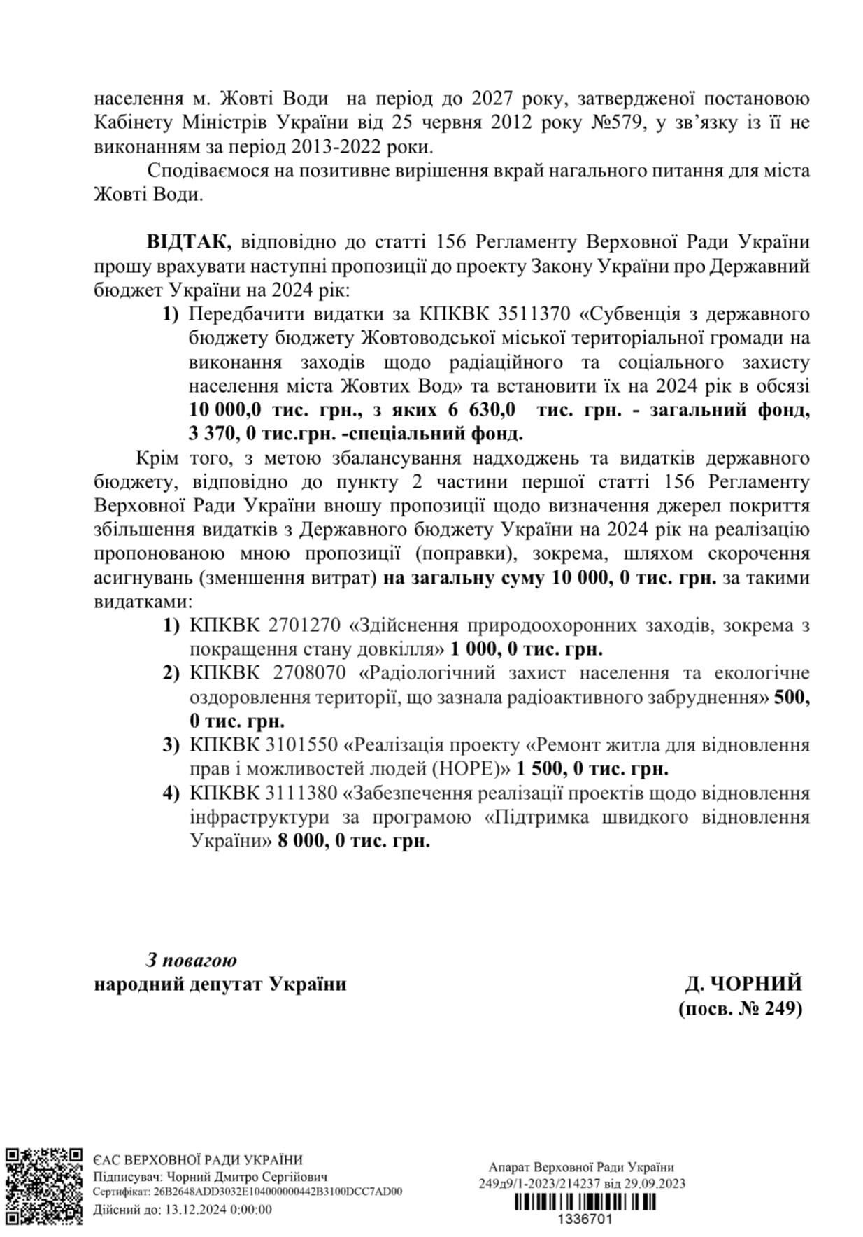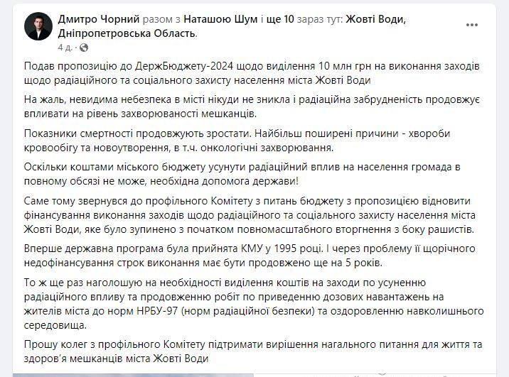 По словам Дмитрия Черного, к нему обратились местные власти Желтых Вод с просьбой посодействовать выделению 10 миллионов гривен из бюджета в 2024 году на борьбу с радиацией. Как отметил нардеп, программа по устранению последствий работы "Восточного ГОКа" существовала и раньше, а теперь нужно просто продолжить ее финансирование.