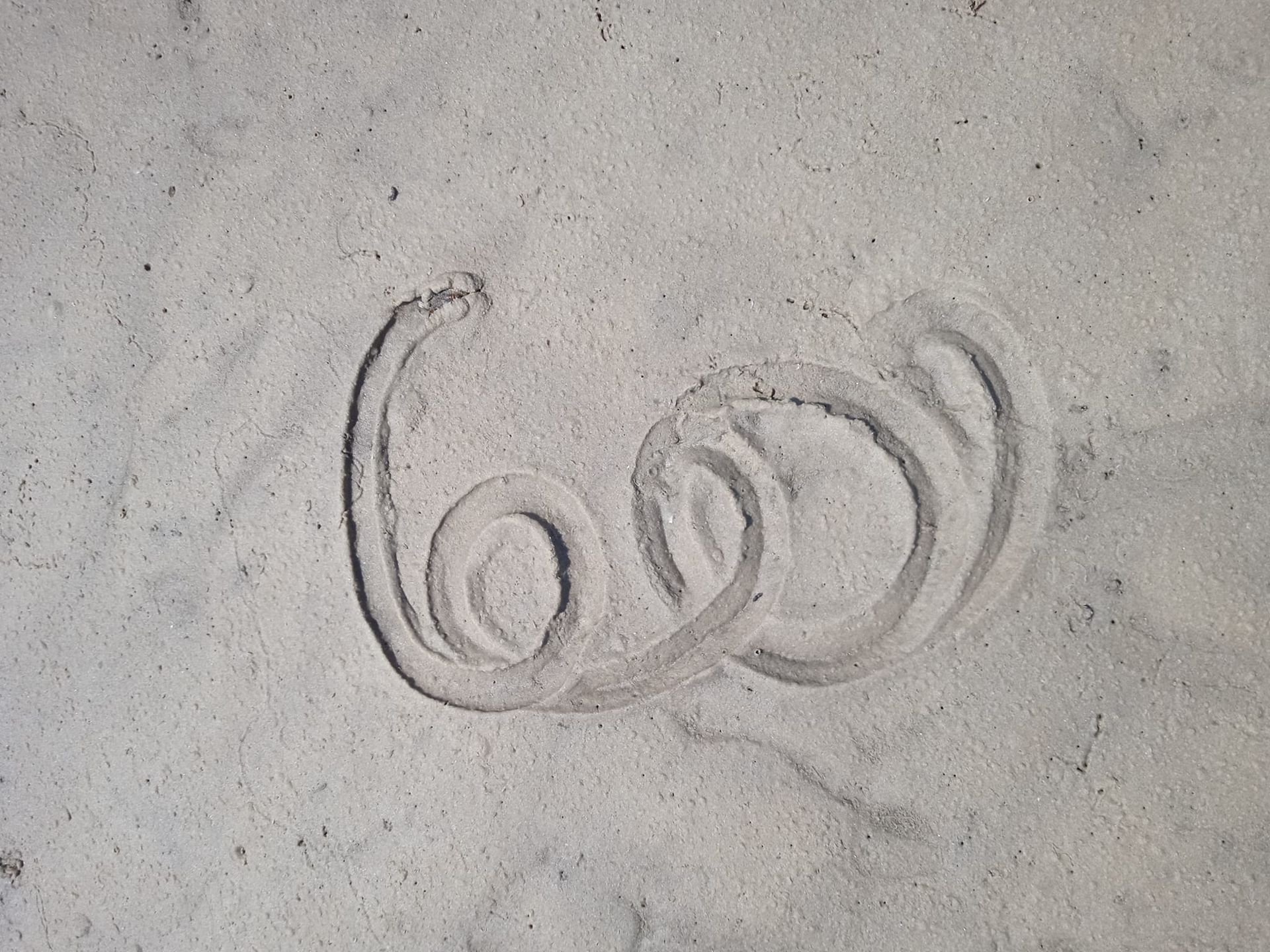 По его словам беззубки, которые не в состоянии добраться до водоема, "рисуют" на песке удивительные узоры. Весь берег вновь пляжа расчерчен линиями, напоминающими шестерки.