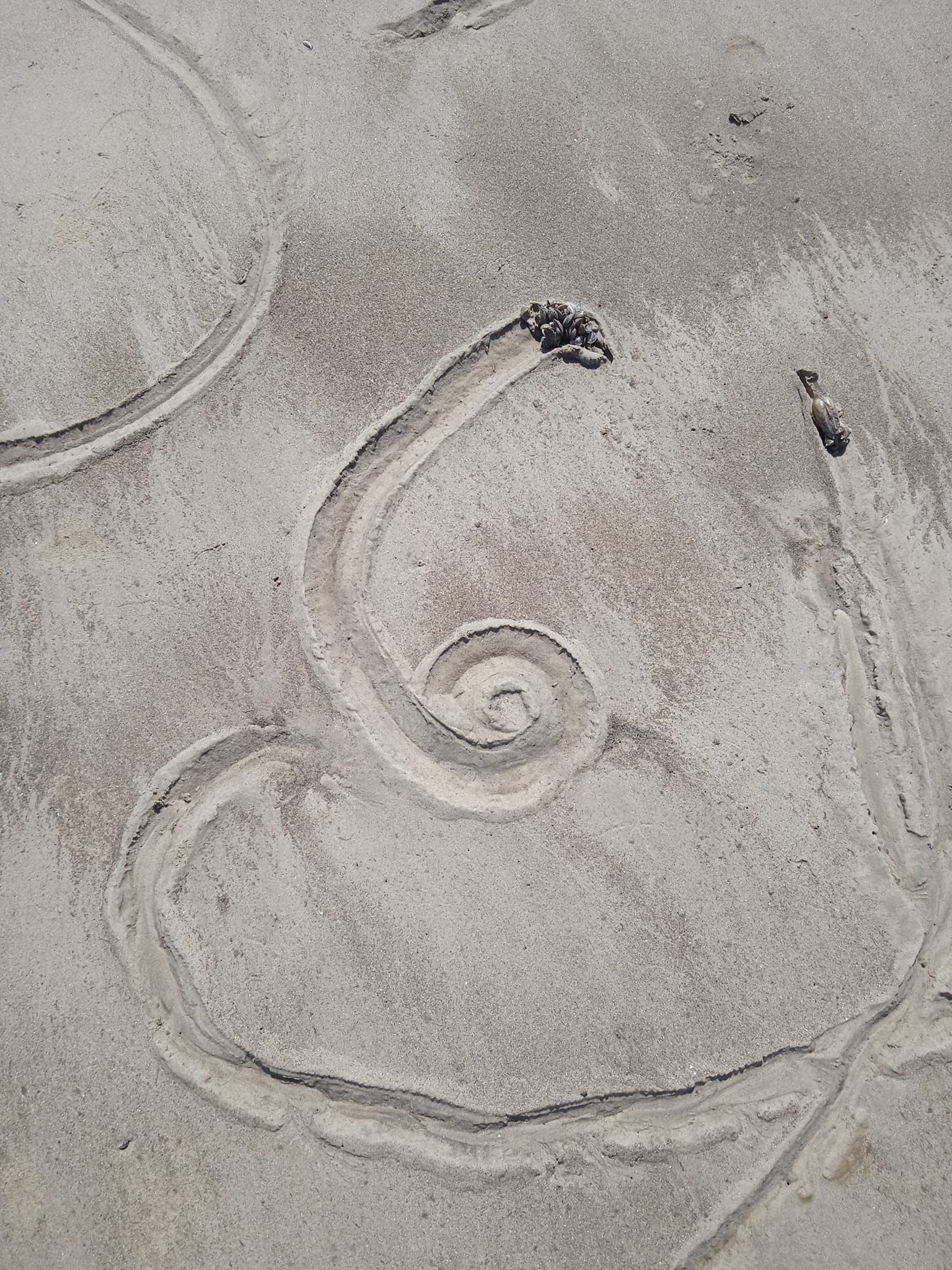 А здесь – трагедия малых существ. Рисунки смерти. Умирая, моллюск Беззубки рисует на песке шестерку. Иногда, если хватит сил что-то более хитроумное. Один, например, изобразил символ бесконечности. Так безмолвно, природа говорит, даже кричит о своей трагедии! Кто умеет читать, тот поймет… – пишет Александр.