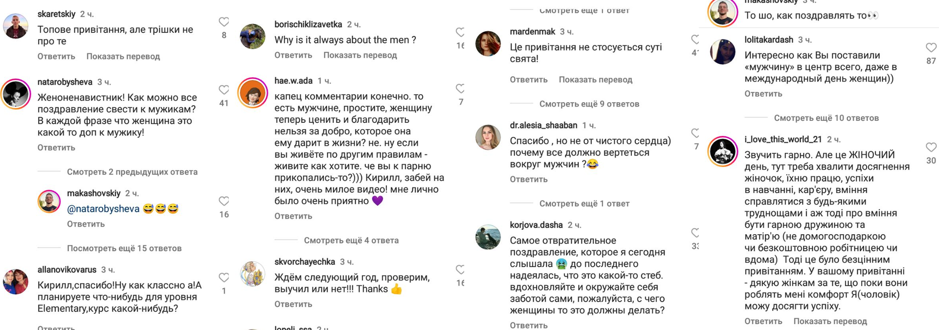 В комментариях под видео разгорелась дискуссия: одни пишут, что поздравление классное, но немного не о том и не касается сути праздника. Другие вообще осудили блогера и отметили, что в своем приветствии он все свел к мужчинам - "женоненавистник".