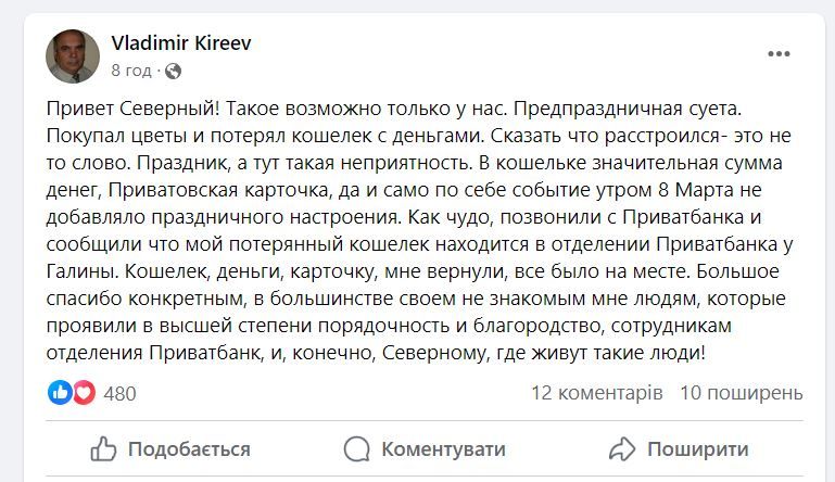 Житель Днепра Vladimir Kireev утром 8 марта потерял кошелек, когда покупал цветы на рынке. Однако через несколько часов ему позвонили из банка, чтобы сообщили, что кто-то нашел его деньги и карточку.