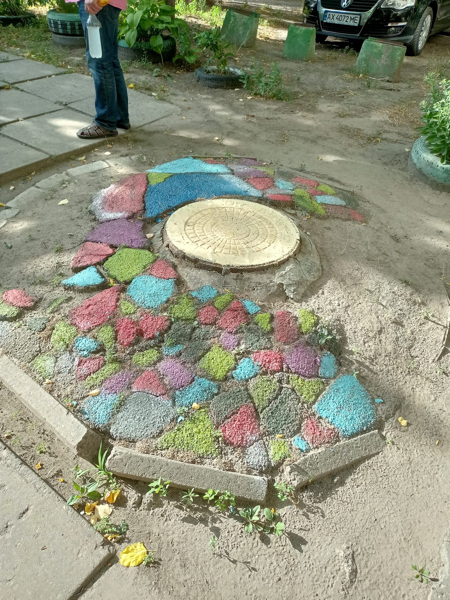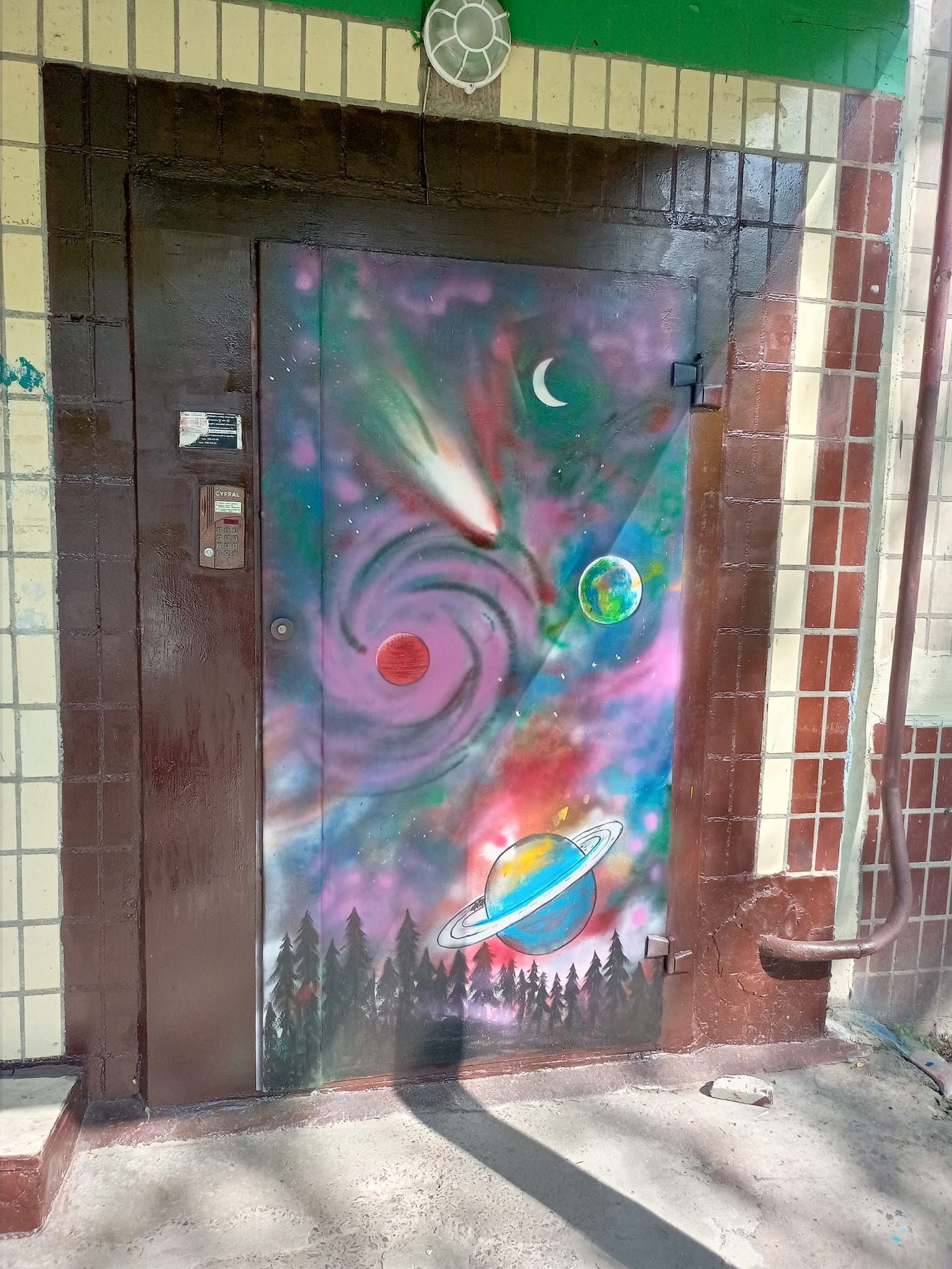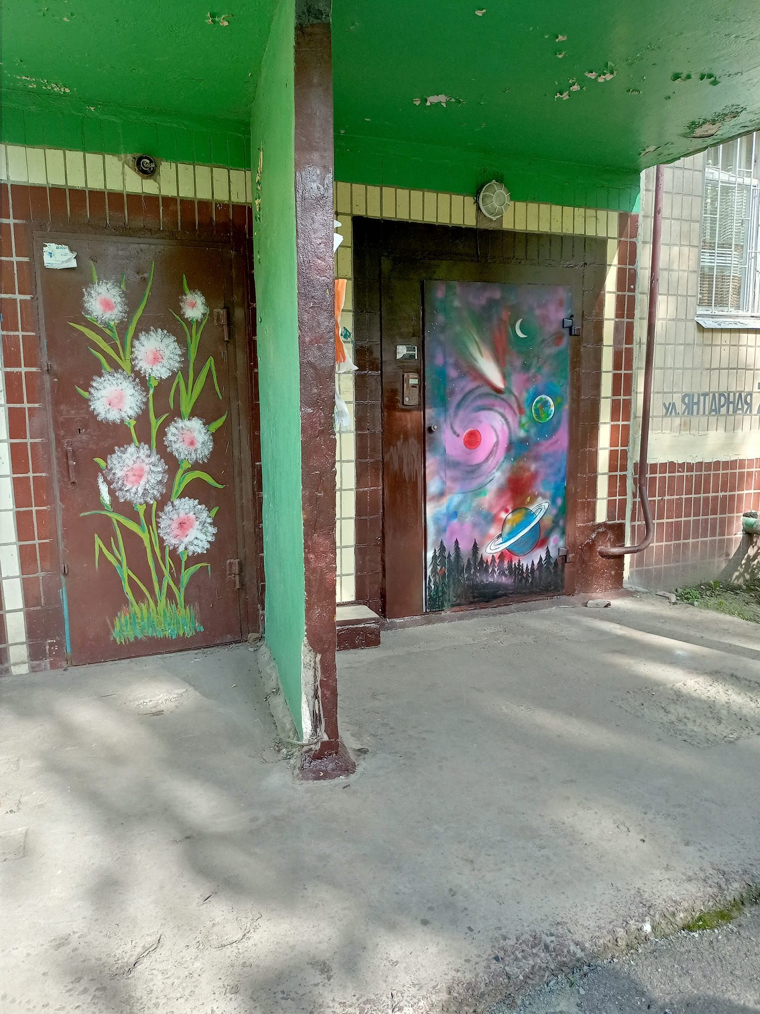 Як розповіла Ольга, на дверях під'їзду по вулиці Янтарній поблизу нового скверу, з'явився стилізований малюнок космосу. Намалювала його мешканка будинку Катерина Олексіївна. Жінка робить такі розписи не вперше, раніше вона розмалювала асфальт біля багатоповерхівки. Таким чином, потріскана дорога виглядала, як арт-об'єкт.