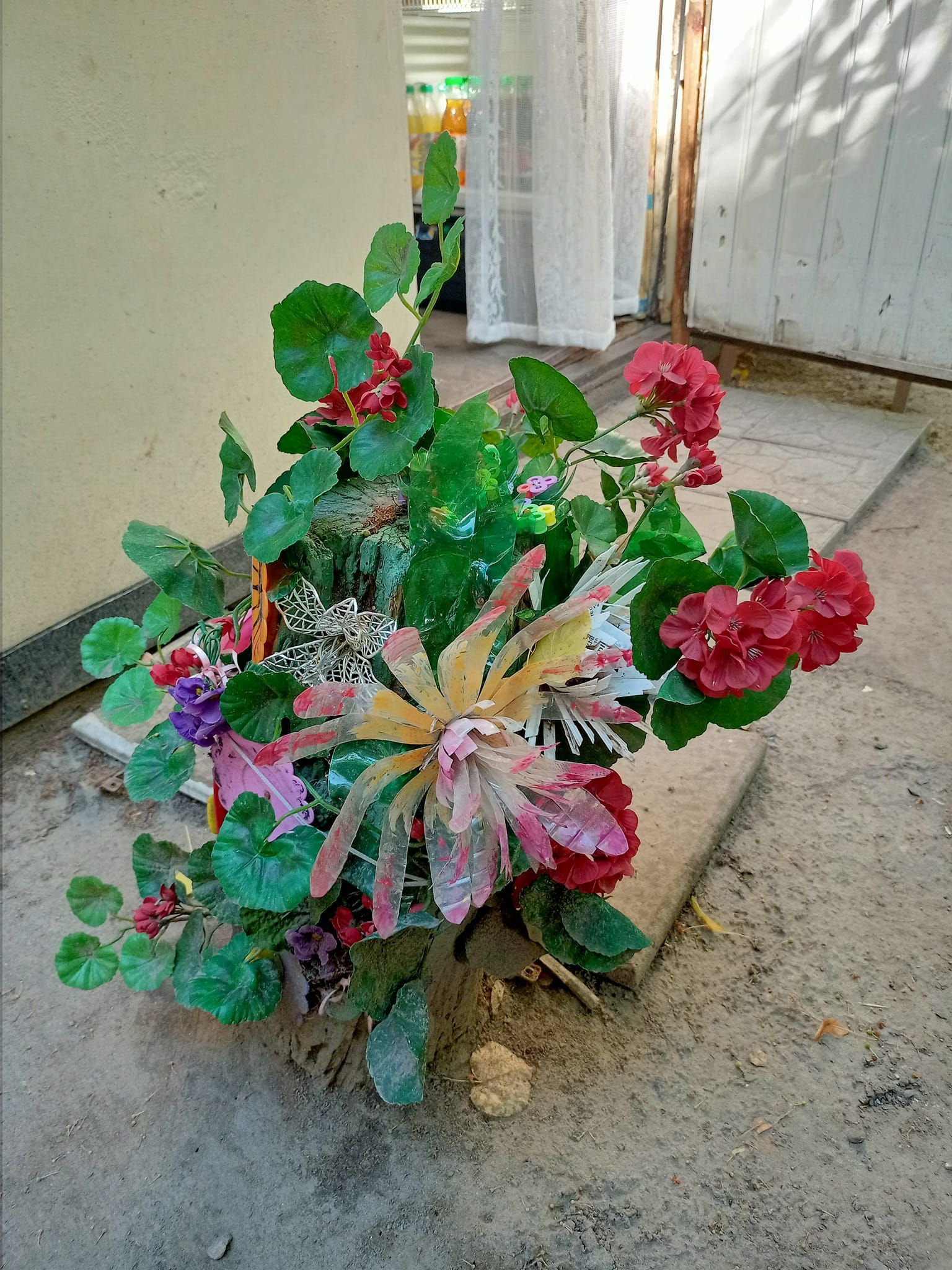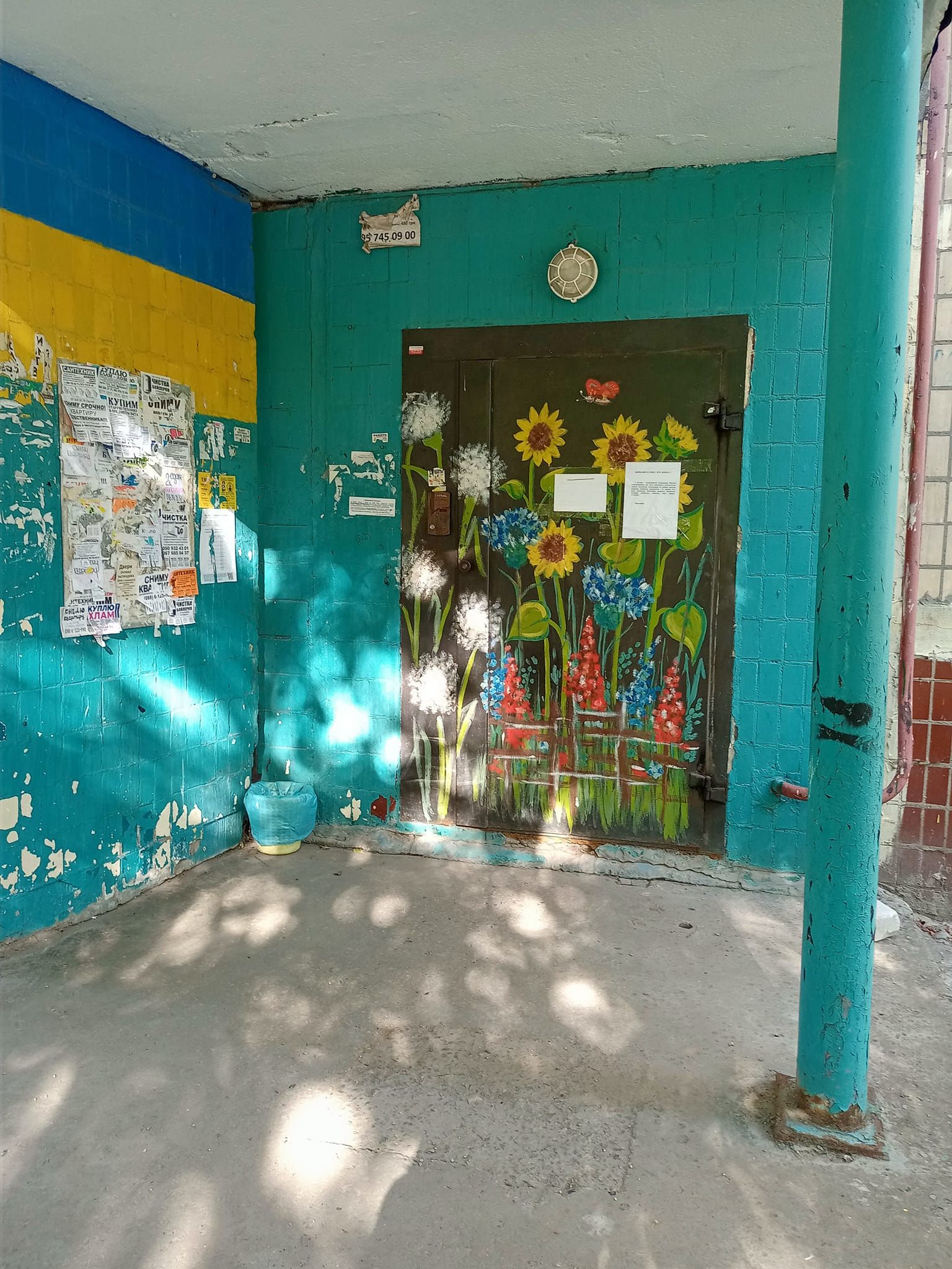 Художниця не захотіла фотографуватися поруч зі своїми роботами, бо соромиться. Але все-таки класно, що поруч з нами живуть люди, які бачать довколишнє середовище трохи краще. Саме вони прагнуть прикрасити старий пеньок квітами, перетворюють асфальт в арт-об'єкт, і бачать полотно в звичайних дверях під'їзду, - зазначила Ольга.