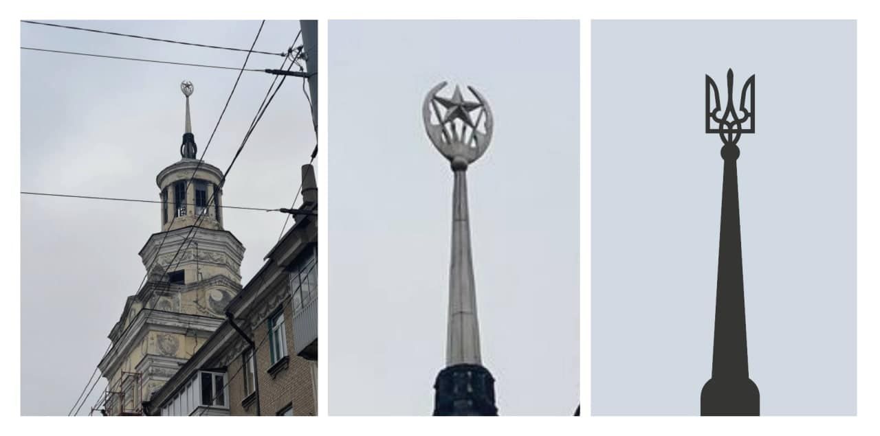 Так, на Рабочей на одном из домов уже много лет возвышается шпиль в виде советской звезды. Как сообщили на ФБ-странице "Пространство самоуправления департамента по вопросам самоорганизации населения", очень скоро эту звезду заменят украинским тризубом.