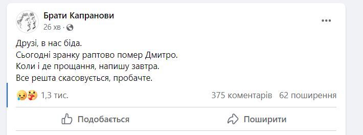 Друзья, у нас беда. Сегодня утром внезапно скончался Дмитрий. Когда и где прощание, напишу завтра. Все остальное отменяется, извините, — говорится в сообщении.