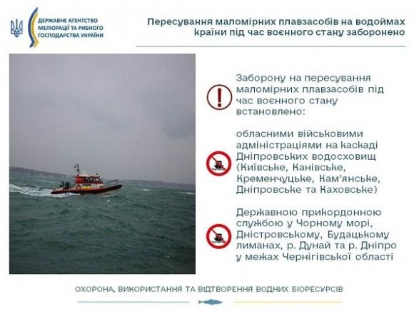 Областные военные администрации установили дополнительный запрет на передвижение во время военного положения маломерных плавсредств, а именно моторных лодок, катеров и яхт. Запрет на передвижение распространяется на каскаде Днепровских водохранилищ: Киевском, Каневском, Кременчугском, Каменском, Днепровском и Каховском.