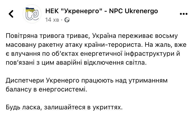 - В Укрэнерго подтвердили атаку на энергосистему. По словам представителя ведомства, это уже восьмая массовая ракетная атака.