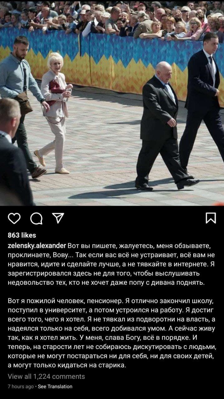 Пару дней назад некоторые СМИ начали распространять информацию о том, что якобы отец Зеленского завел страницу в Instagram и написал пост в поддержку сына. Сегодня же, Александр Зеленский ответил, что не знает ни о каком аккаунте и ничего не писал.