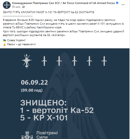 6 сентября, около 8.00, на юге и востоке страны подразделениями зенитных ракетных войск Воздушных сил уничтожены пять из шести крылатых ракет Х-101, выпущенных из самолетов Ту-95МС из района Каспийского моря. Кроме того, сегодня подразделением зенитных ракетных войск Воздушных сил уничтожен ударный вертолет российских оккупантов Ка-52 «Аллигатор». Слава Украине! Вместе – к победе! - говорится в сообщении.